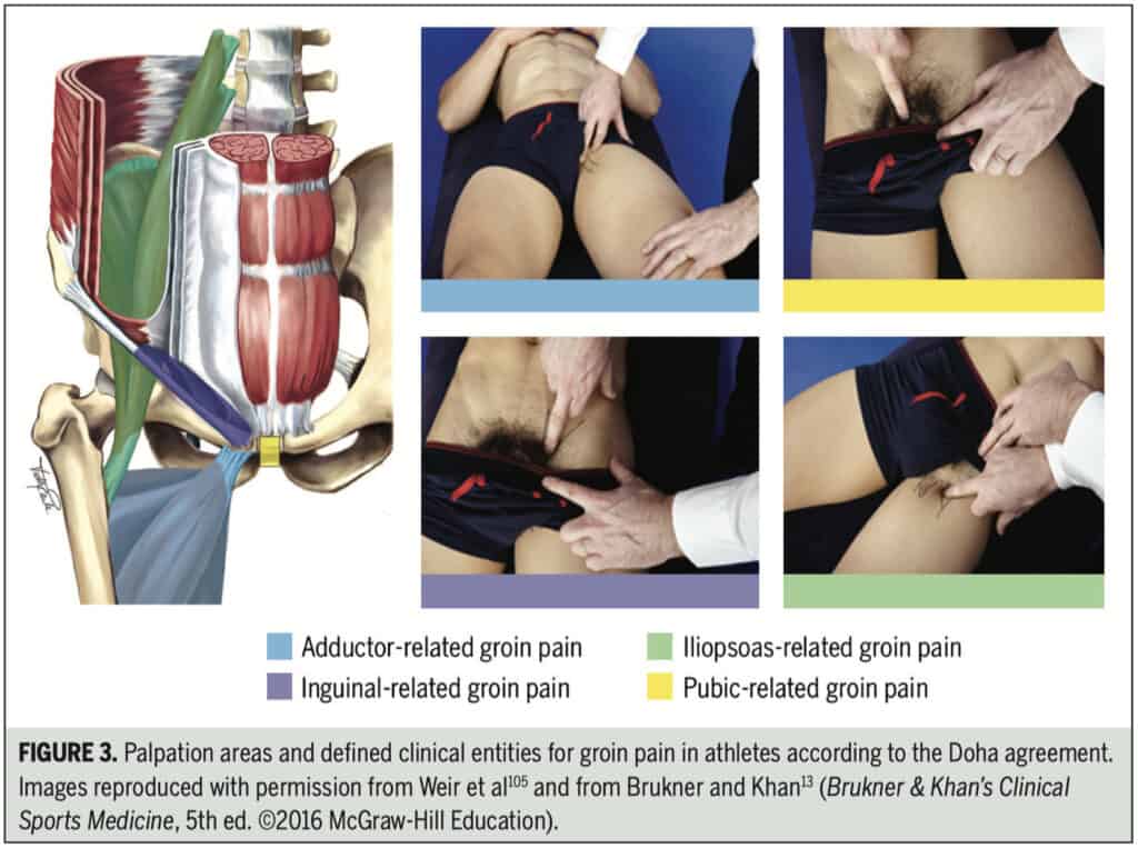 - 5 mögliche Schmerzquellen: Adduktoren, Schambein, Leiste, Iliopsoas, Hüfte